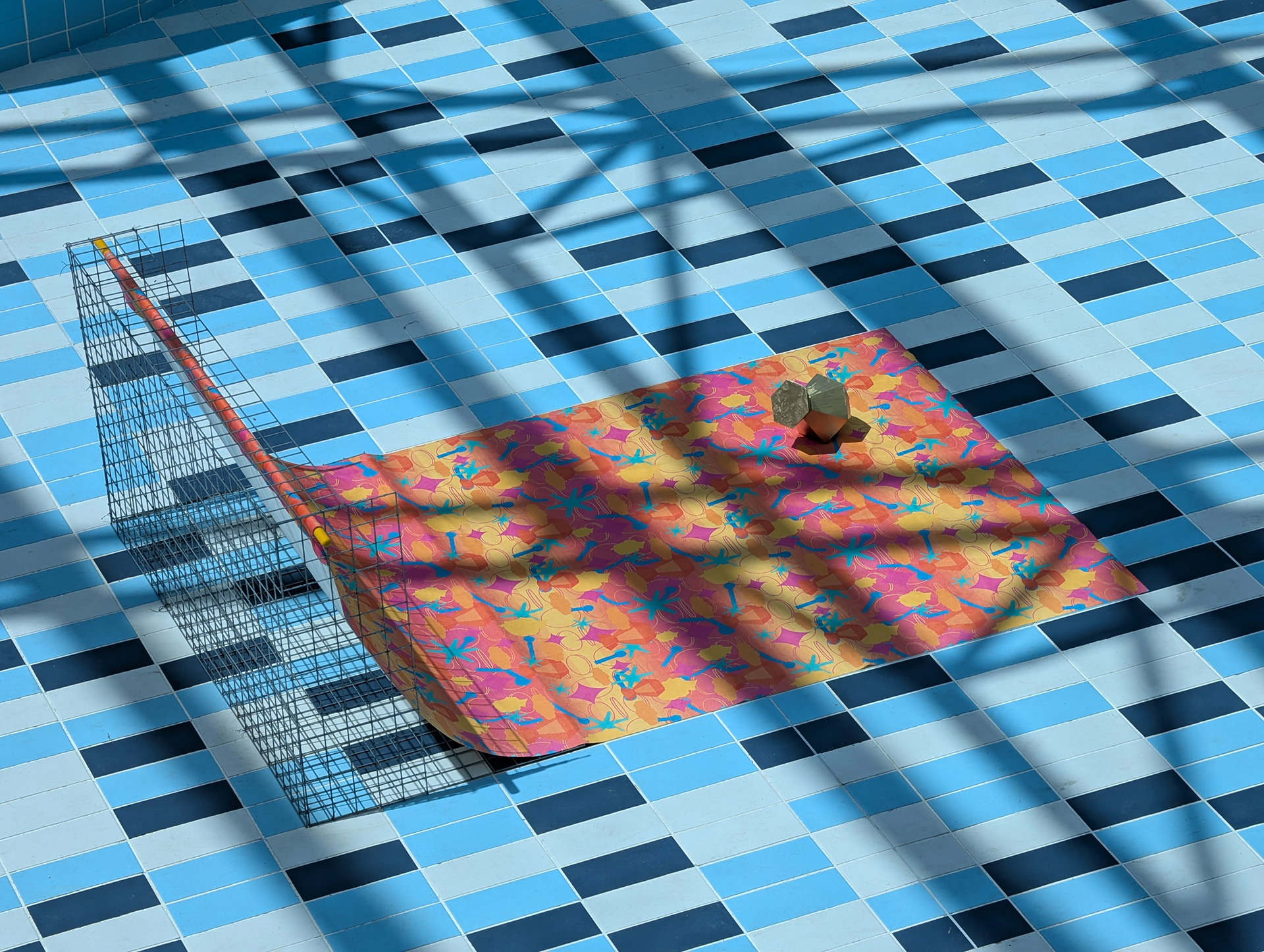 Presented curving onto the floor from a pole it shares language of a photography backdrop, with flowing curtains, or perhaps the last remnant in a carpet warehouse.