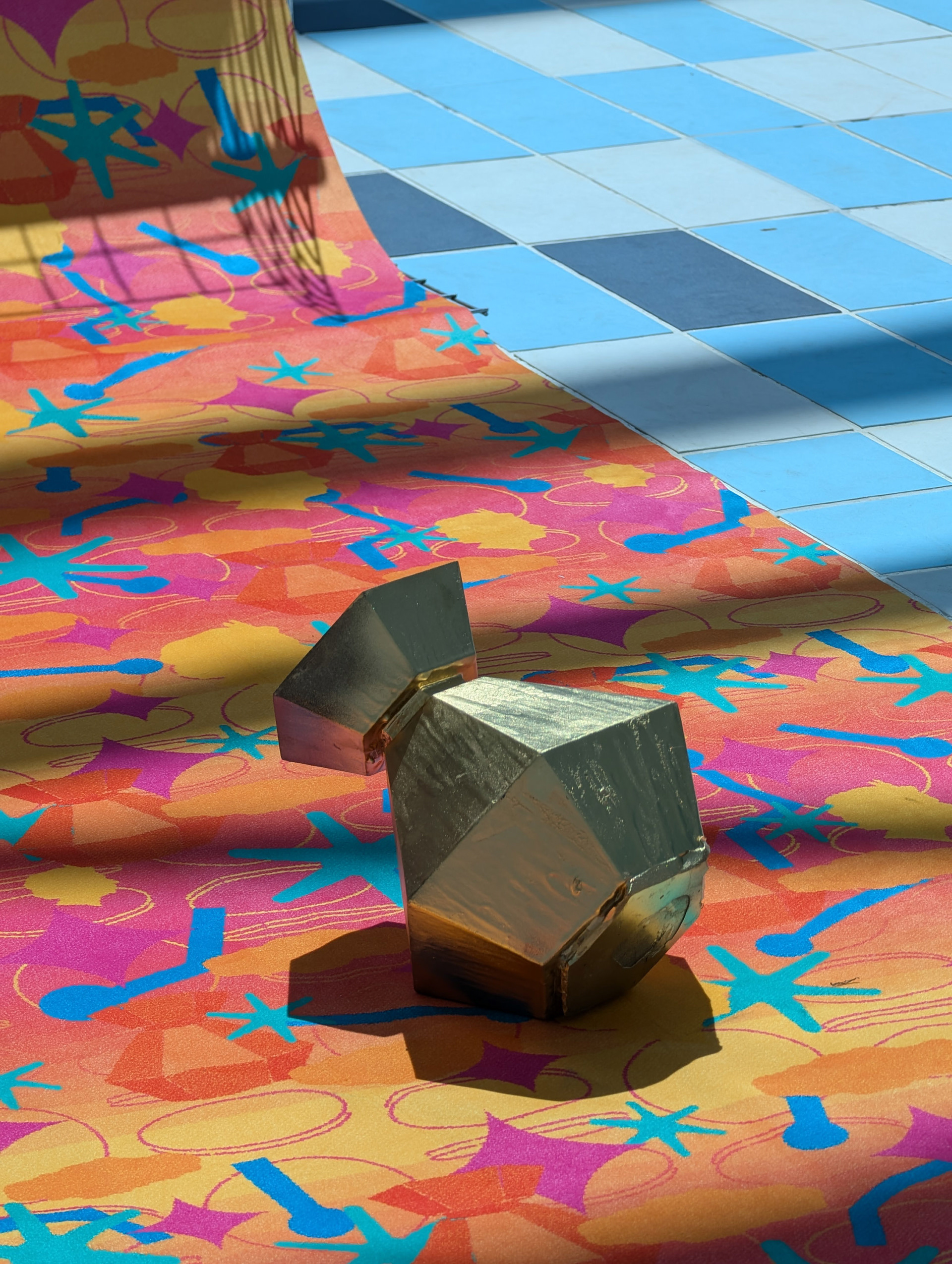 Carpet Diem II, a wordplay on Carpe Diem features a digitally printed fabrication of an arcade carpet. Designed to be a faithful analogue to classic arcade carpets it utilises colours and symbols prevalent throughout the exhibition such as falling coins, coin pusher machine, golden nugget, golf holes and queens head, among others.