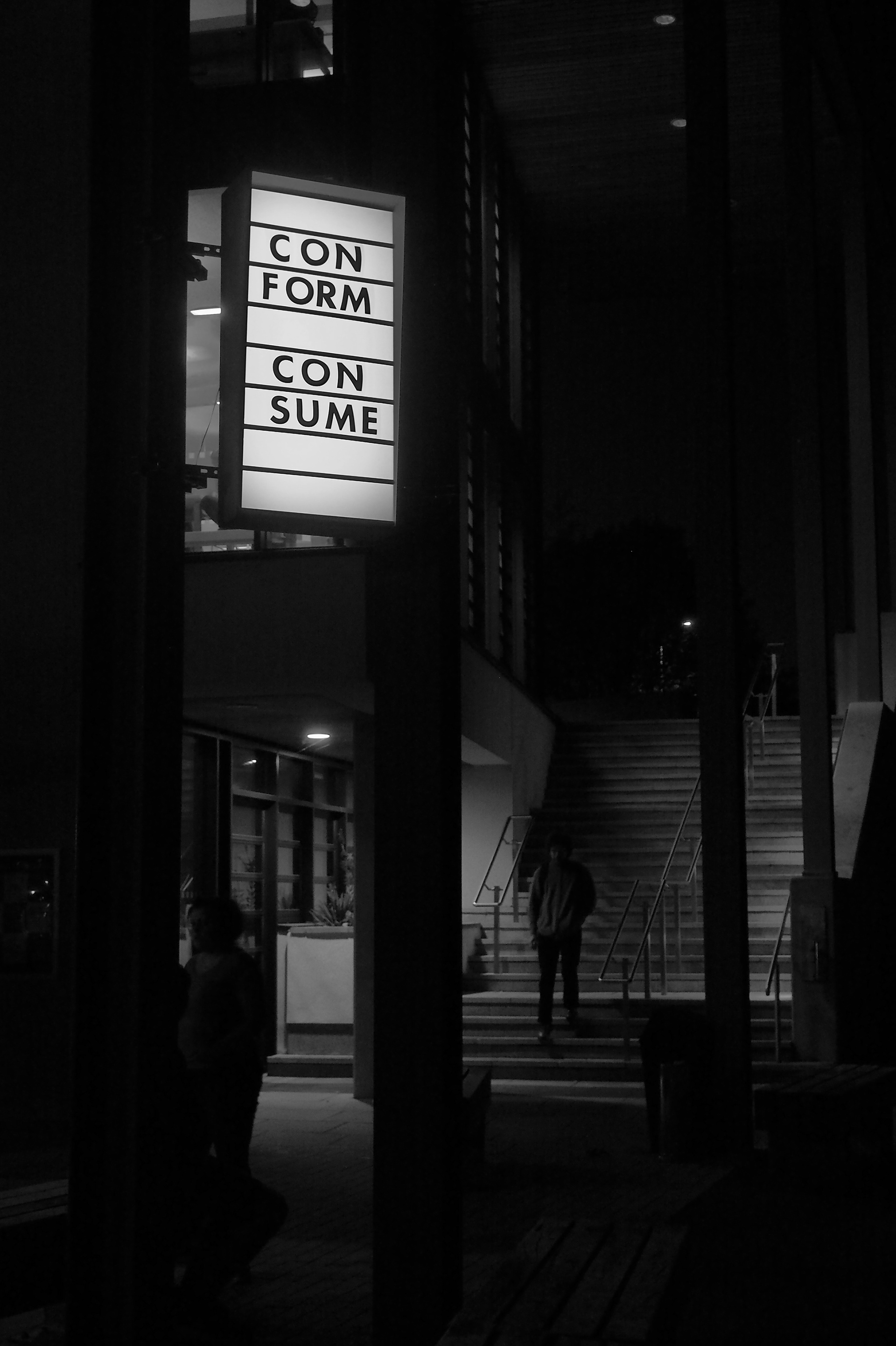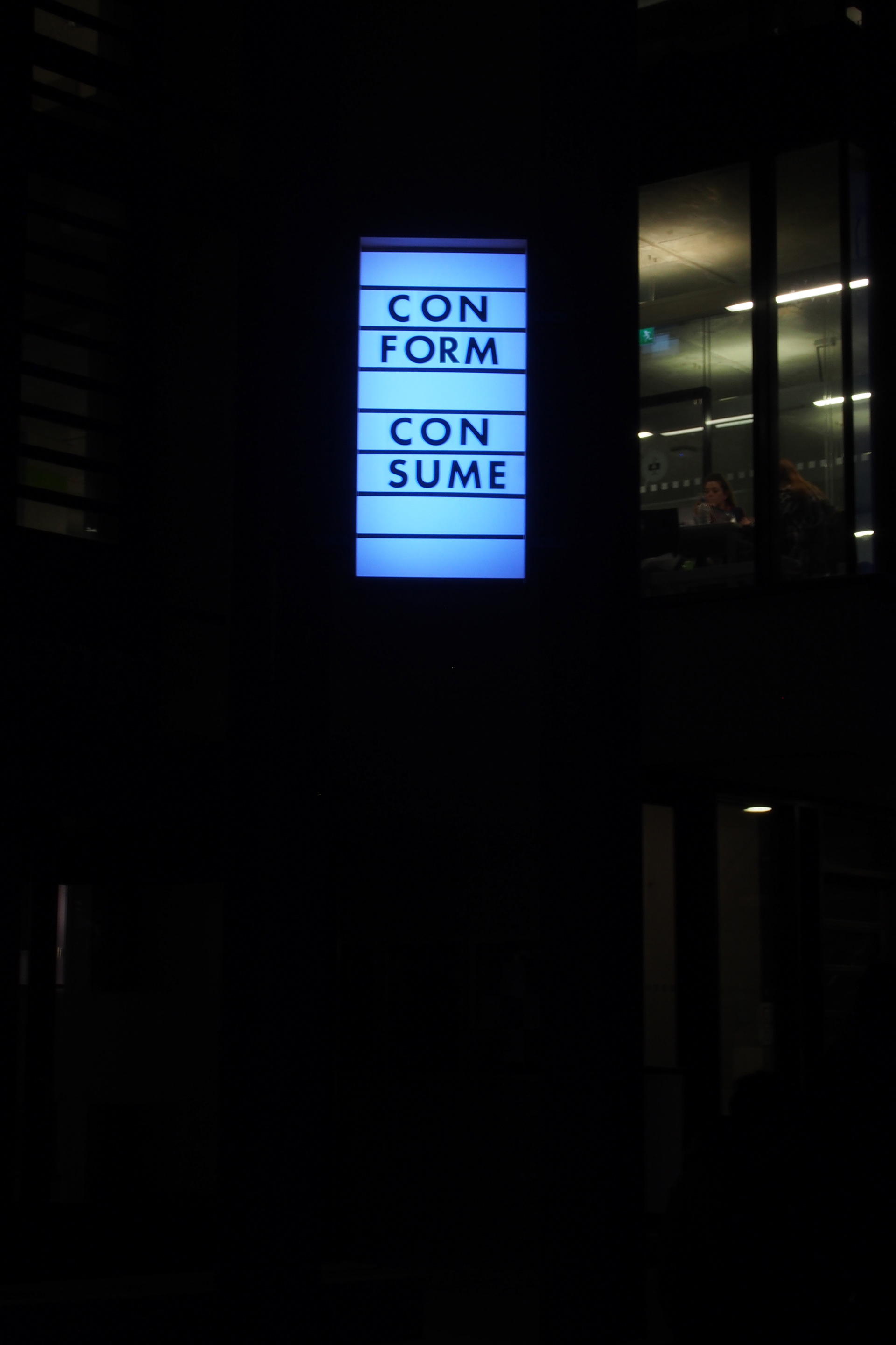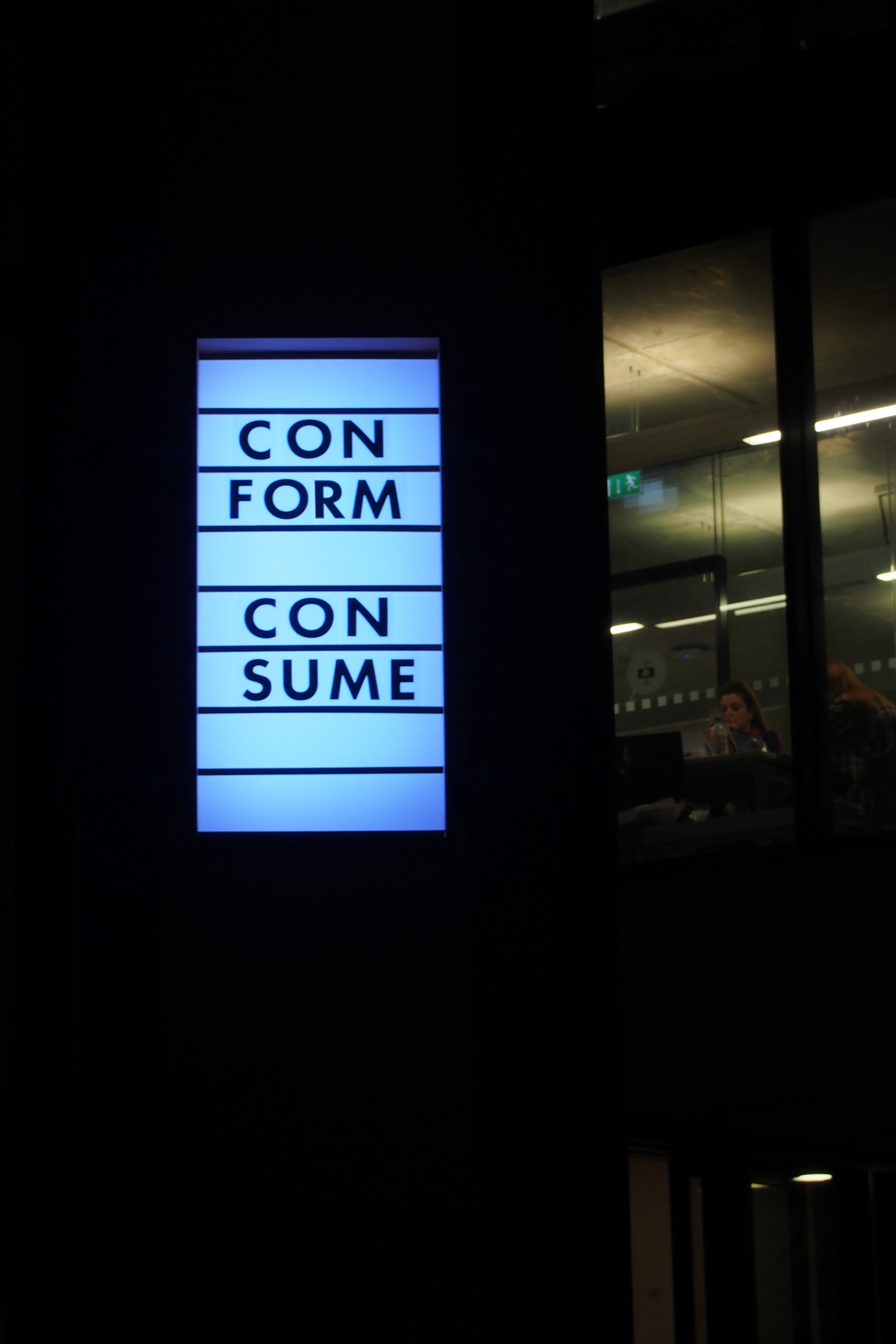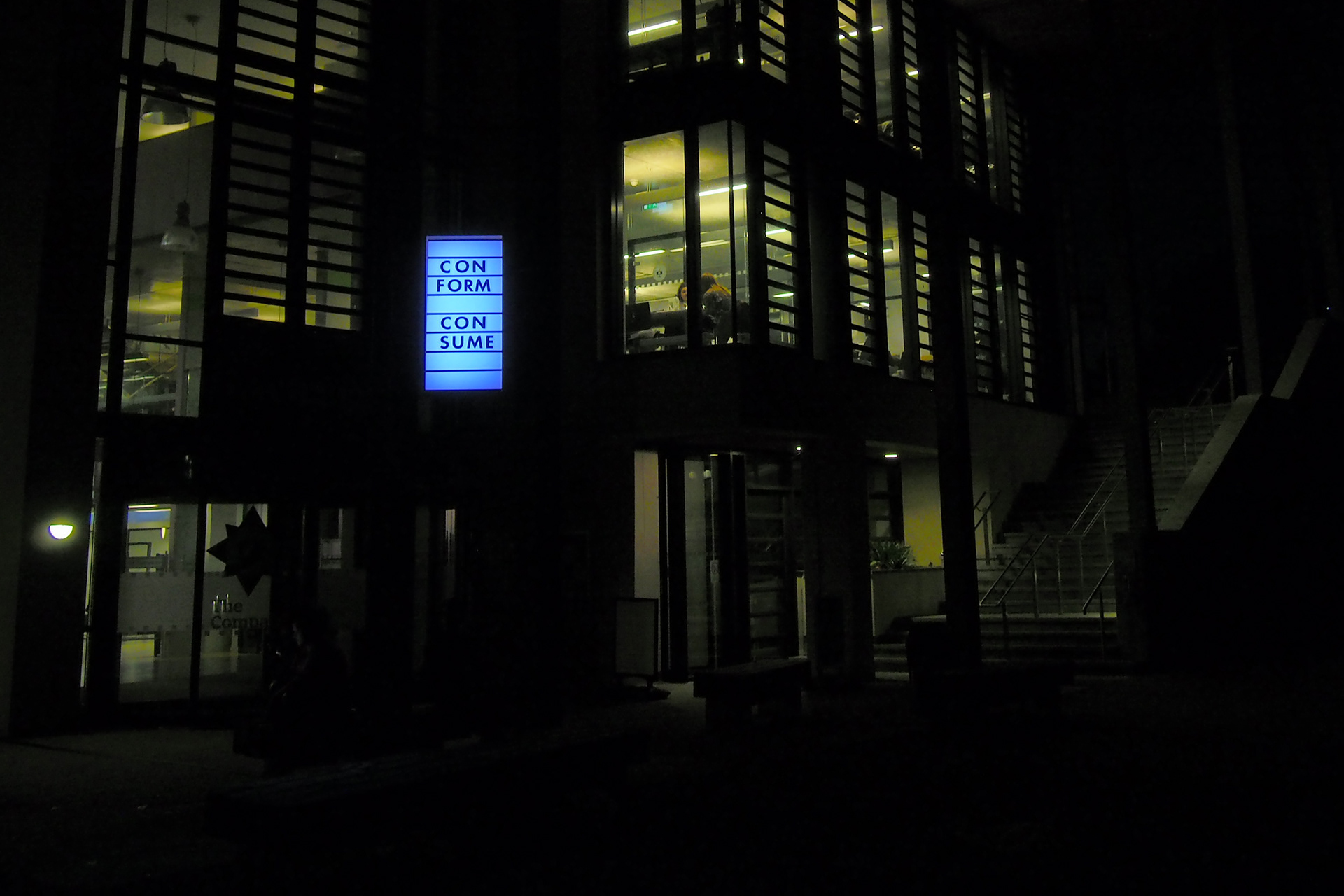 A light up marquee style sign with text installed at the joint Falmouth / Exeter, Penryn campus.