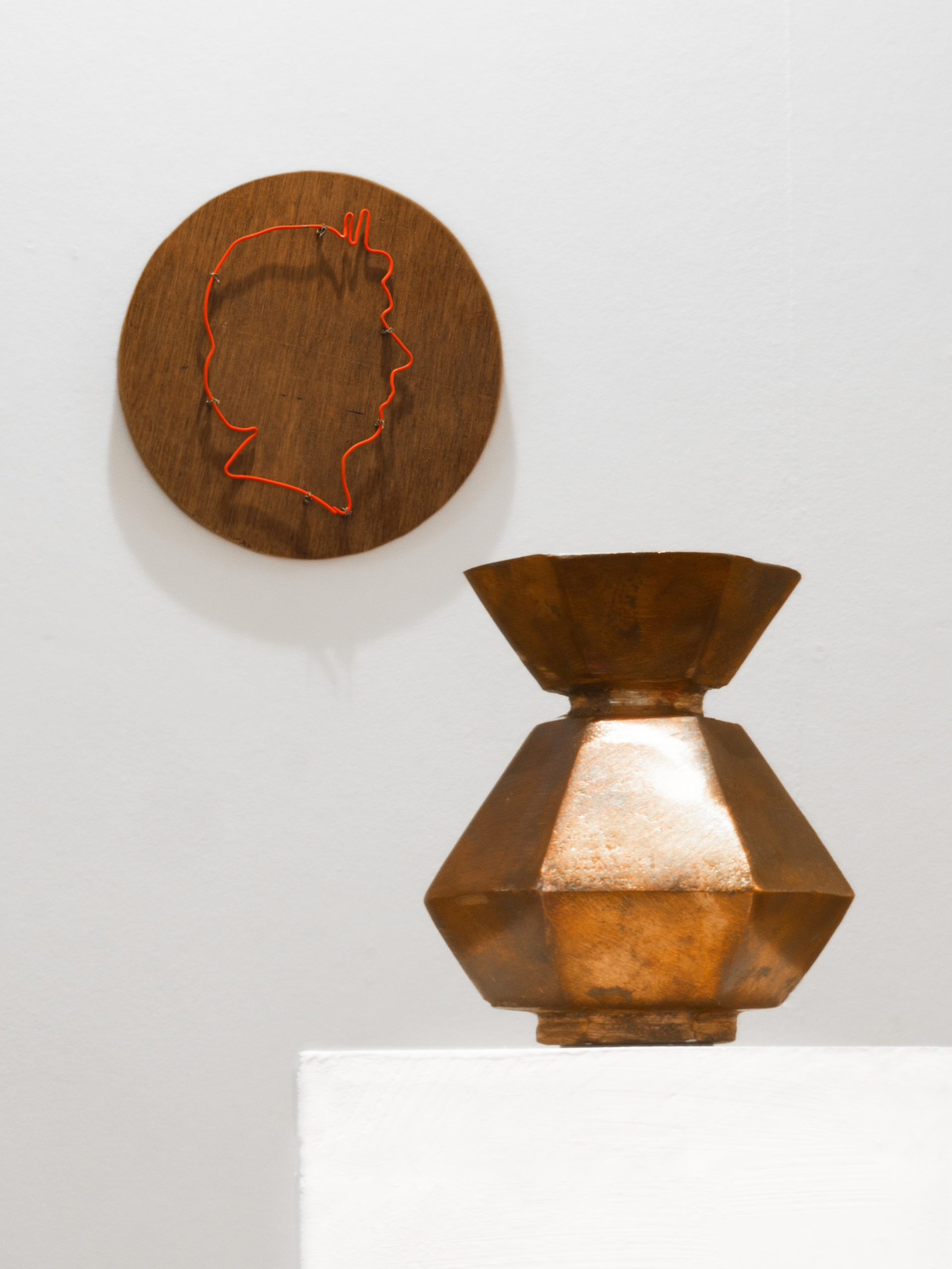The cast sculpture’s central position in the space allows for it to be viewed in different contexts with different works in the exhibition visible behind, depending on viewing point.
