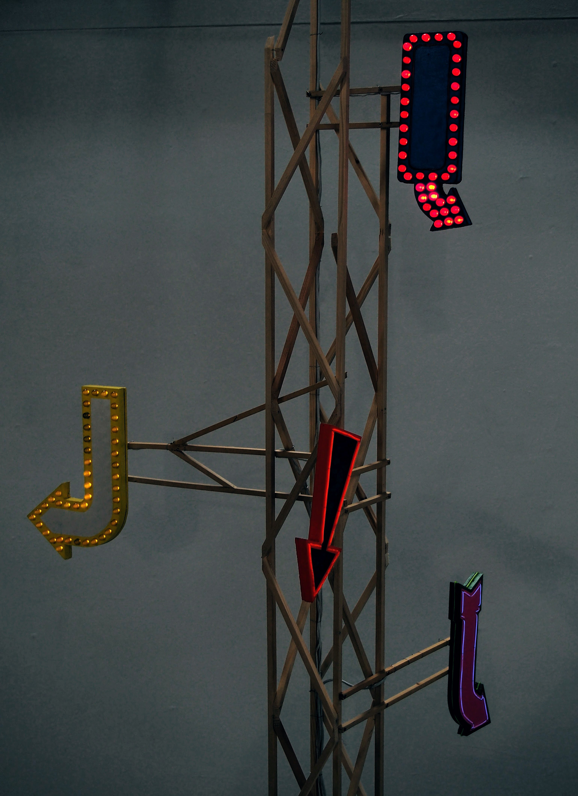 In this exhibition the sign becomes a metaphor for the choices we have available in our lives. These choices are often contradictory and with little beyond the facade, but none the less we are given an illusion of choice and control over our futures.