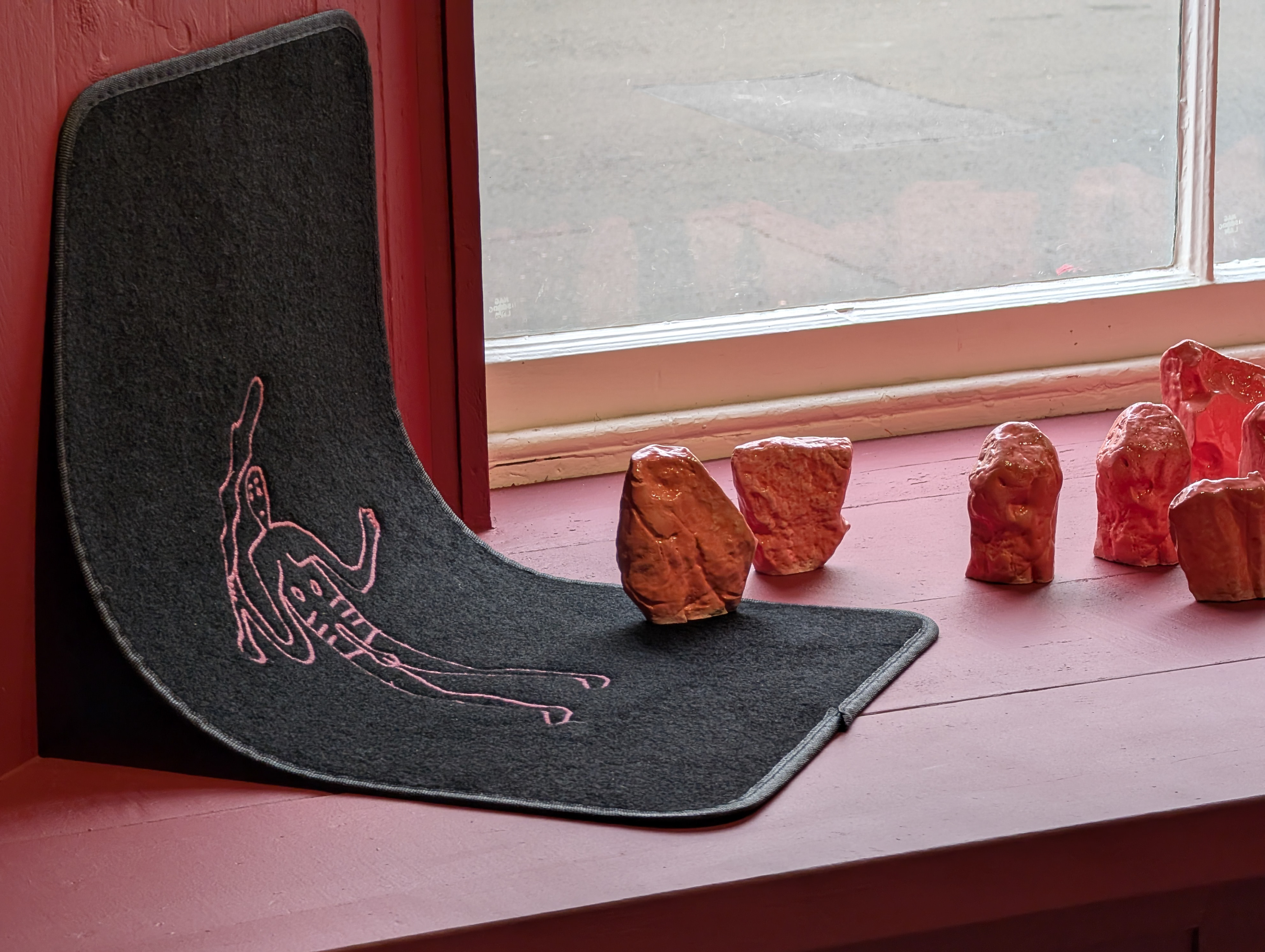 Ceramic duplicates of selected stones from Avebury sit ordered alongside, and breaching onto an embroidered car mat with the form of the Cerne giant. These works explore ideas of nostalgia, souvenir and the way we choose to remember key events and people, incorporating ideas of journey with the crossover between ancient traditions and folklore with personal narratives and family traditions
