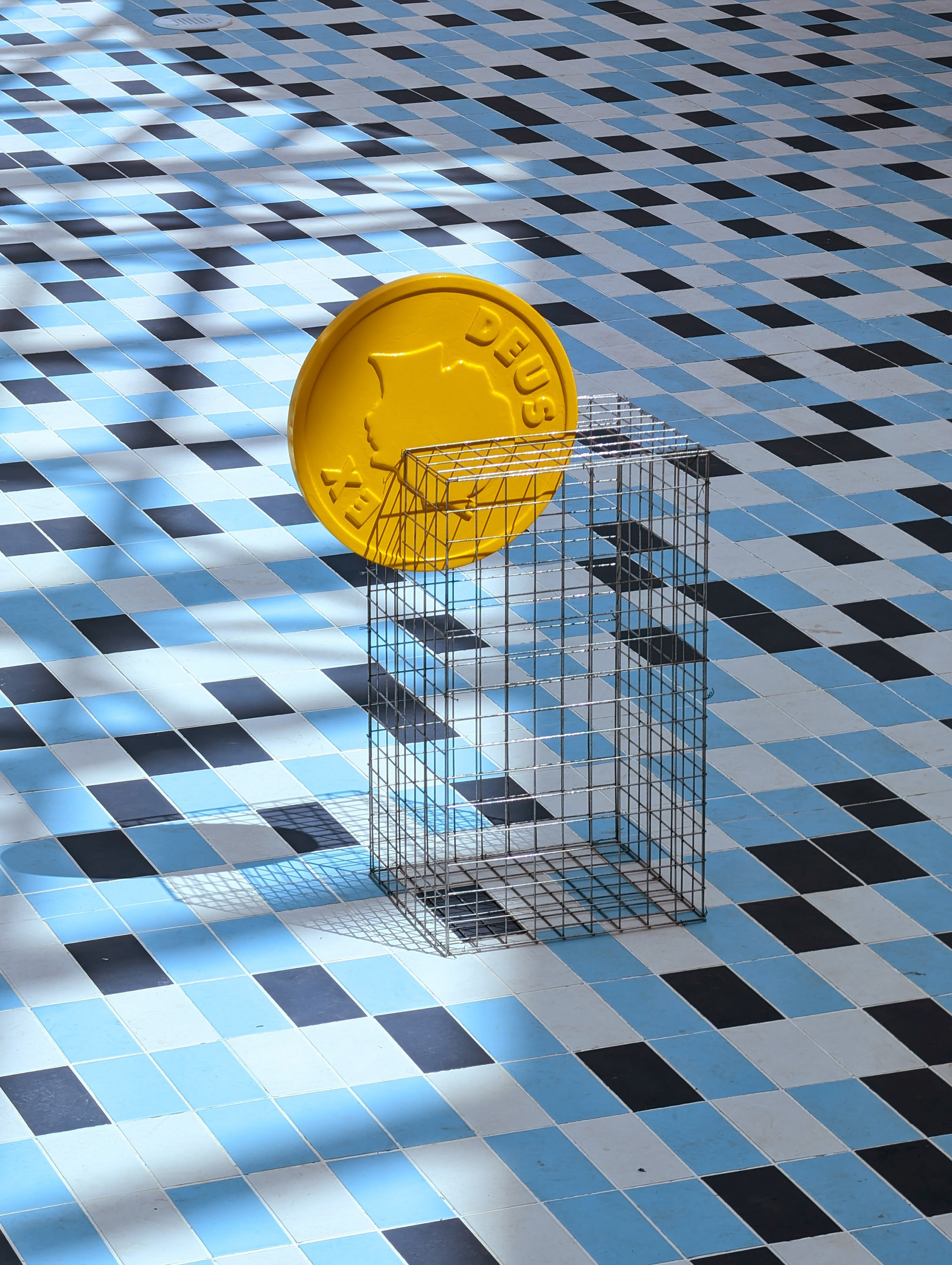 ‘Slot’ as with other works featured plays with the symbol of the 2p coin, the design matching that in ‘Automatic Change Giver’ and ‘All Things Fall II’ and featuring the coin pusher symbol. It features Deus Ex/Two Pence written on each side in a play on common Latin coin text while translating as ‘God From Two Pence’, an absurdist nod to Deus Ex Machina (God from the Machine) a plot device where the day is saved by an improbable intervention. This, along with the scale of the oversize coin speaks to the power of a simple 2 pence, pushed into a slot in an arcade machine to save even the rainiest of British seaside holidays.