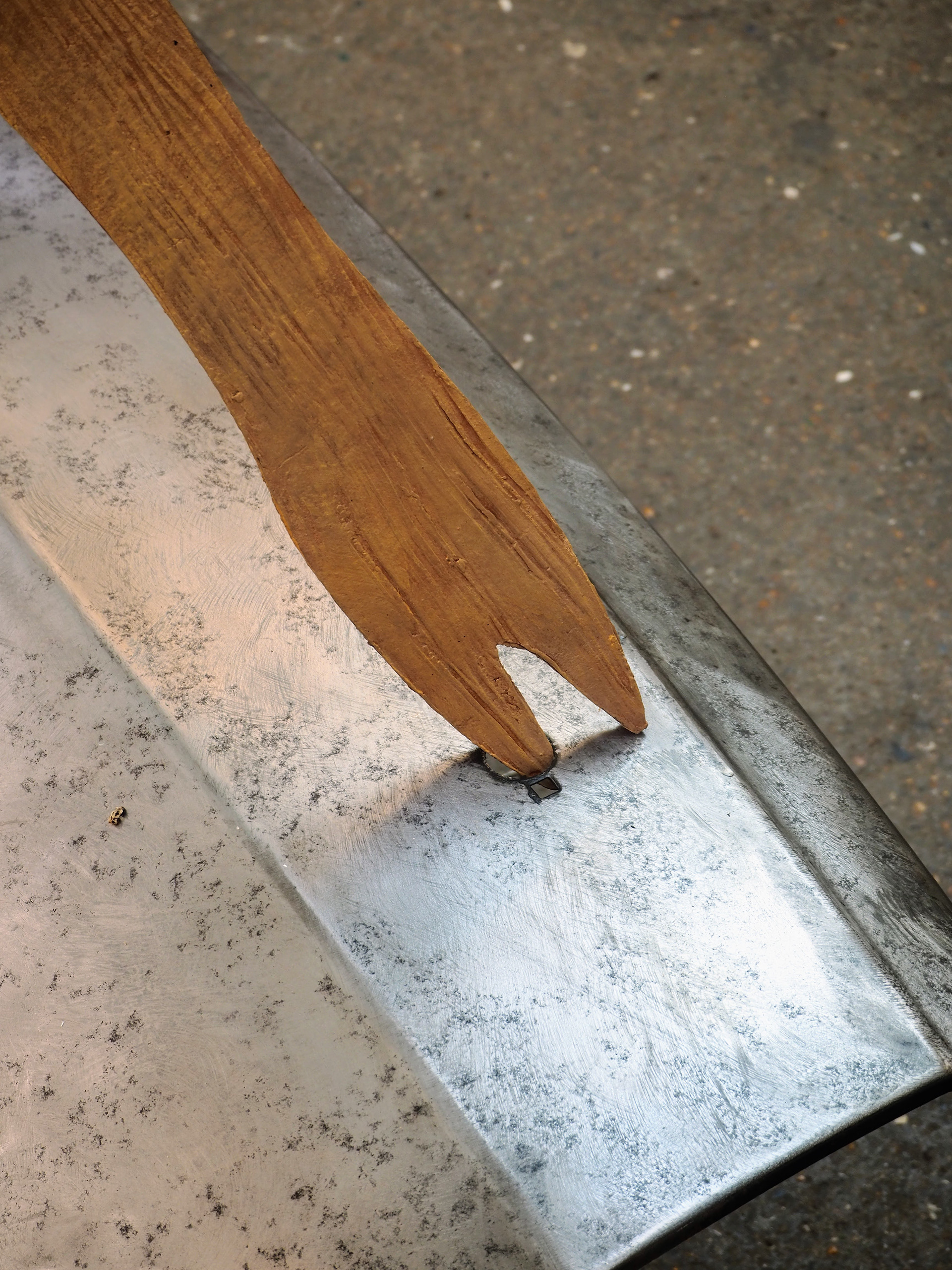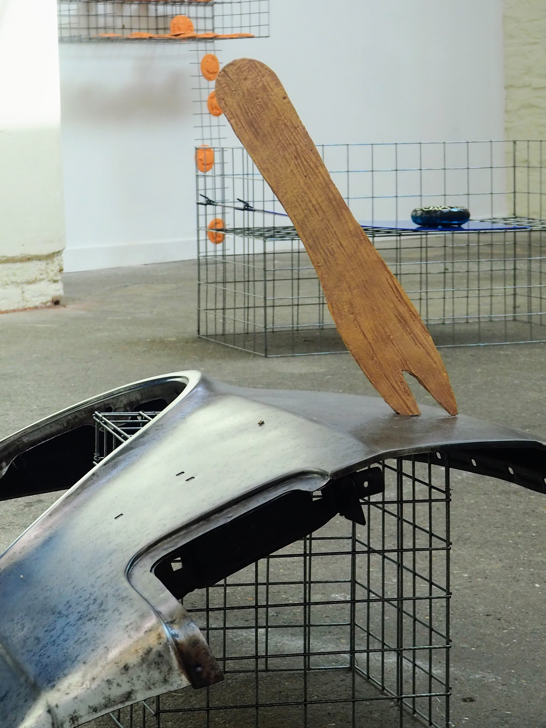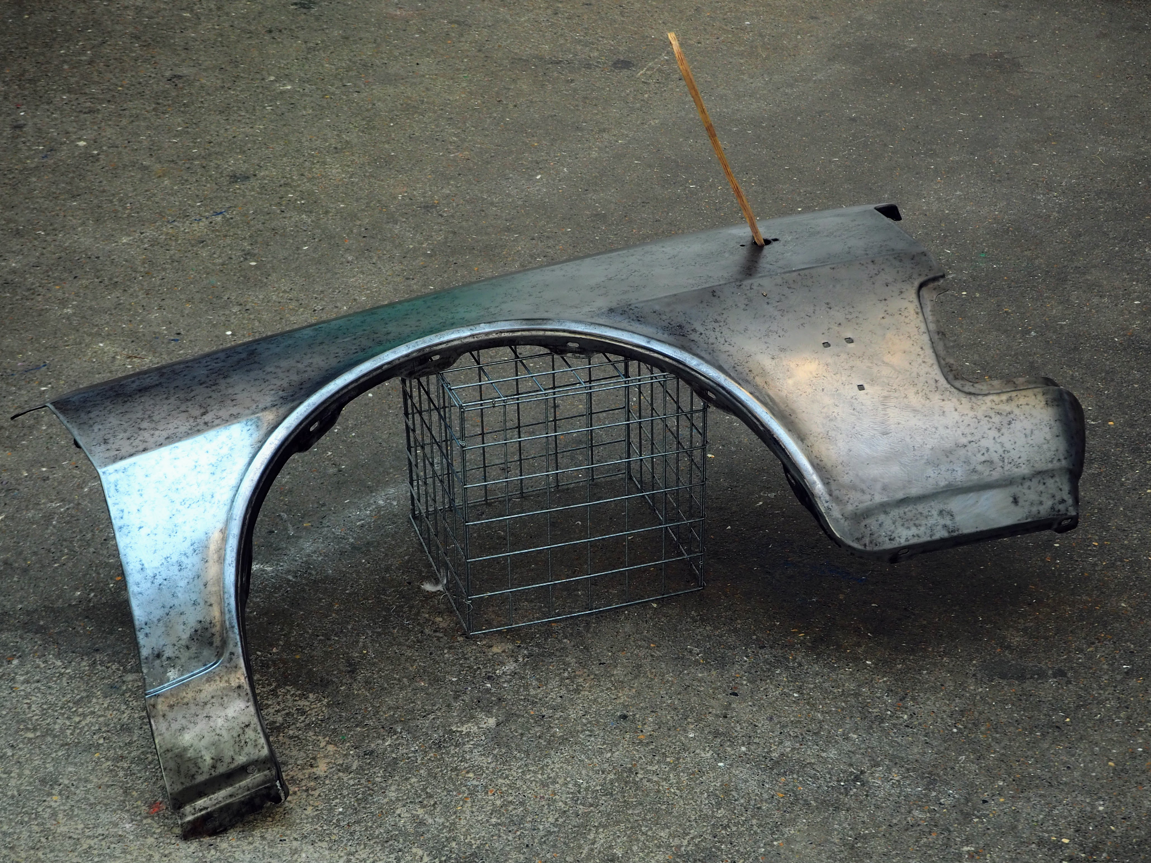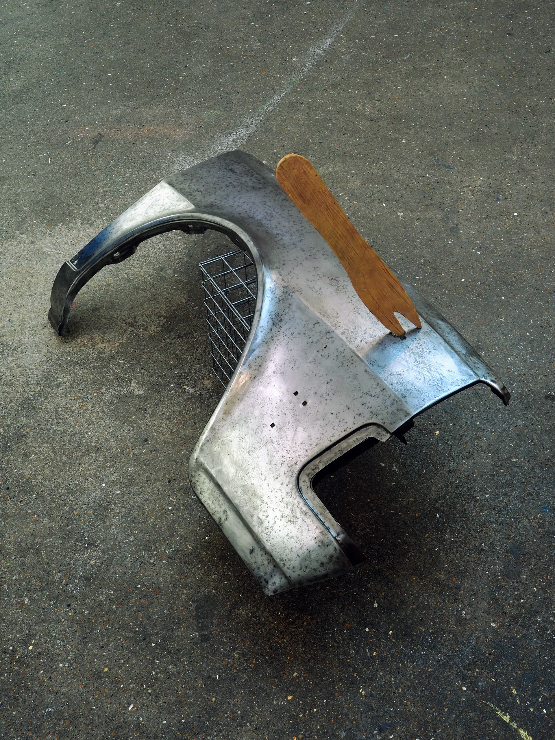 A wing panel from a Volvo 340 sits, skewered by an improbable ceramic chip fork.