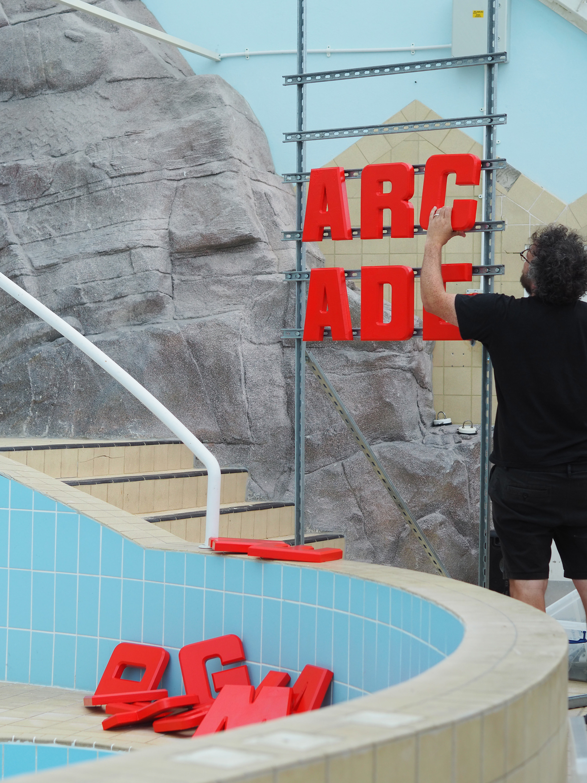 With the majority of sculptures in the confines of the pool-bowl itself, tiled in a frenetic pattern of three blues, Robinson’s work exerts a confident presence that is woven from colour, scale and ambition.